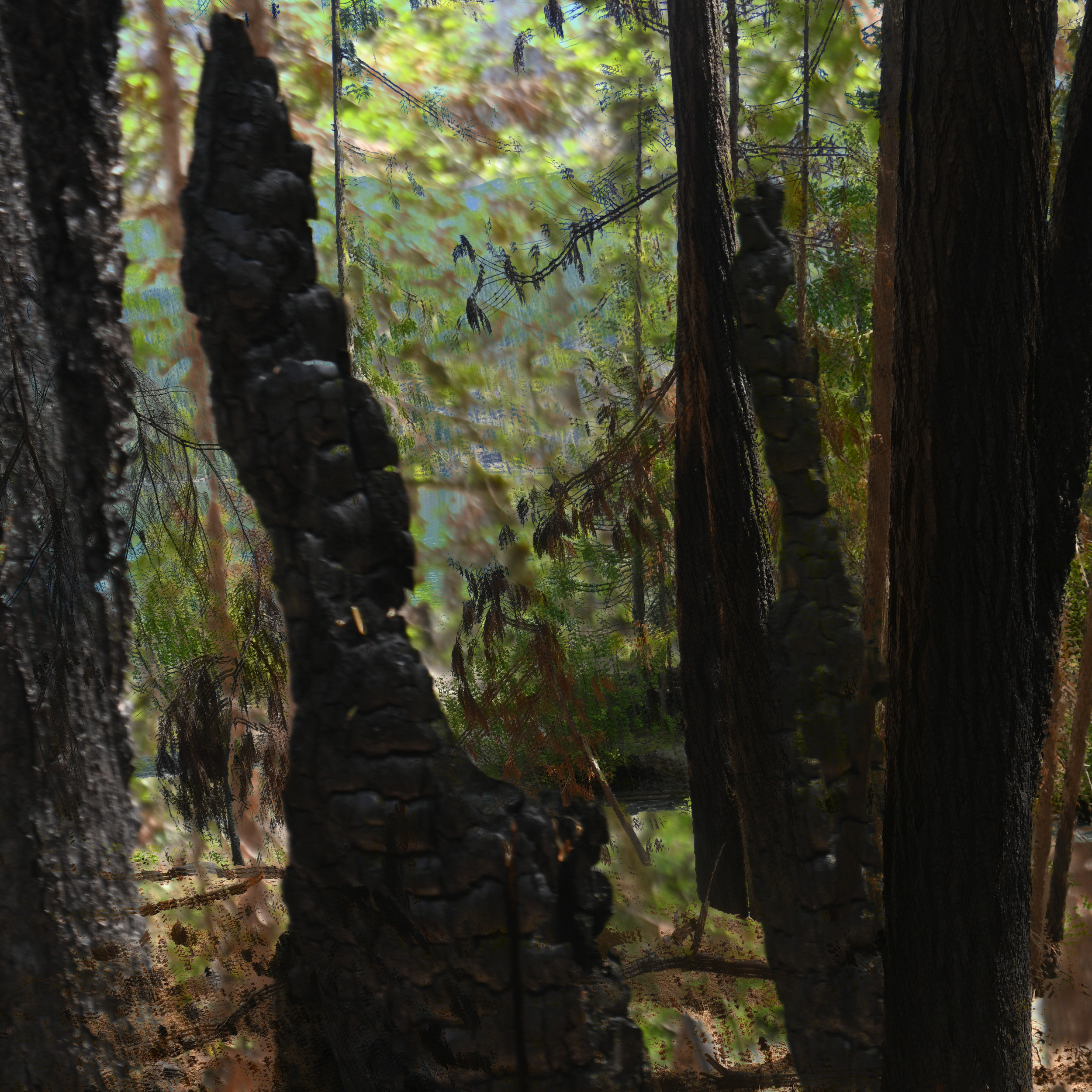 Inspired by the fires which swept through the Valhalla Wilderness Park in 2024. Having gone through a year of smoke and evacuation the year before in the Okanagan Alison and Pippa were asked to bring their place based art practice to Valhalla. We listened, merged with more than human, bore witness and responded creating an immersive installation of sound, fibre and lens based work.